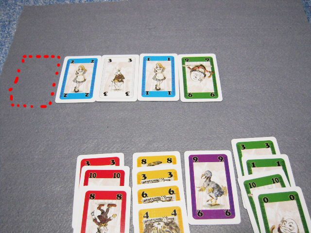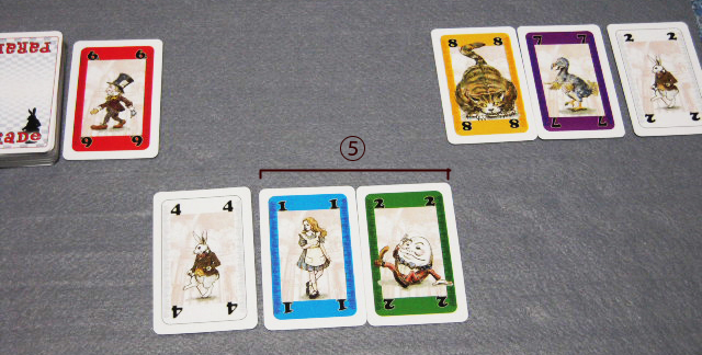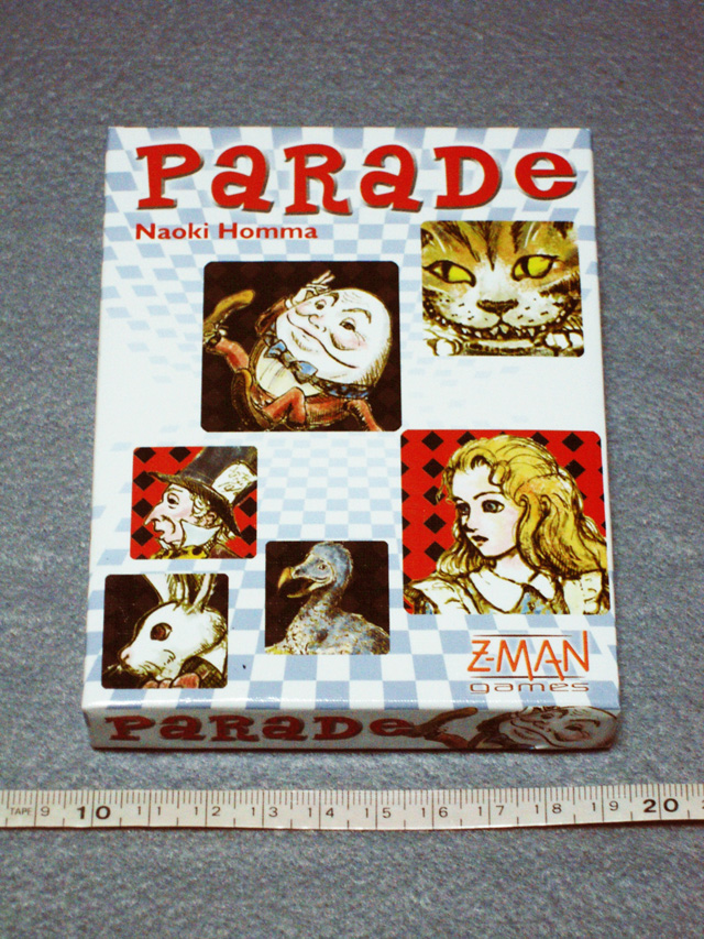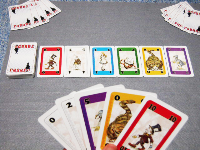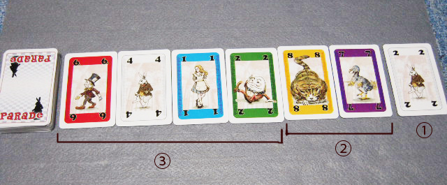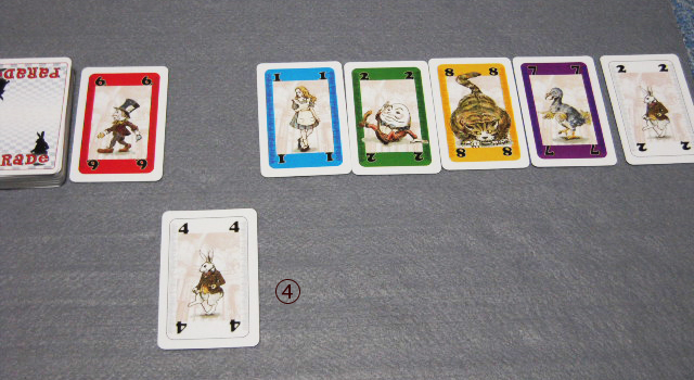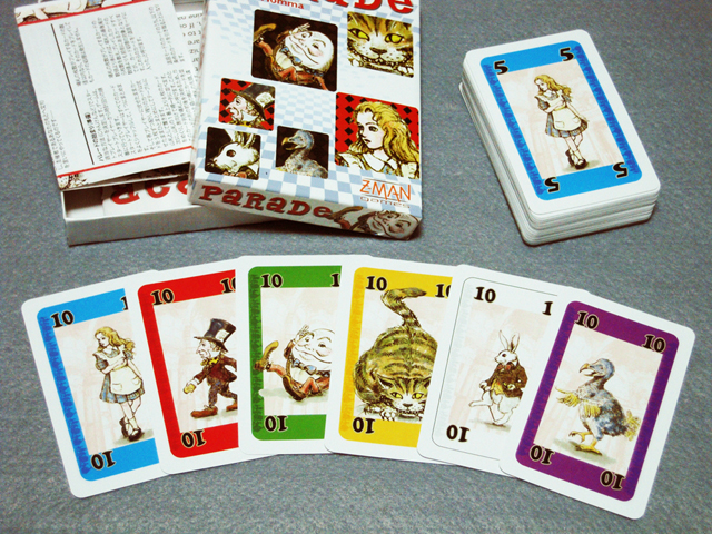 × [PR]上記の広告は3ヶ月以上新規記事投稿のないブログに表示されています。新しい記事を書く事で広告が消えます。 パレード [PaRaDe] 人数:2-6 年齢:10才以上 時間:30分 日本製のカードゲーム。 不思議の国のアリスに登場するキャラクターたちがパレードに参加します。 パレードに参加してる人たちをなるべく抜けさせないようにするゲーム。 カードには6種類の絵柄があり、絵柄ごとに0から10の数字が振ってある計66枚構成。 手順 まずはセッティング。 66枚のカードをよくきって、各プレイヤーに5枚ずつ配る。 そして、場には6枚の「パレード参加者」を並べ、 残ったカードは山として列の先頭にでも置いておきましょう。 3人プレイと仮定するとこんな感じになる。 ここでゲーム開始。 適当に決めたスタートプレイヤーから時計回りで手番が回ります。 手番が回ってきたら以下のアクションを行います。 1.パレード参加者が退屈してきているので、列の最後尾に新しい人材を1人投入しましょう。 ① 例として、手札から白2のカードを選び、最後尾に置きました。 ここで数字と色の説明。 数字はその人材の声のでかさを表しています。 色はその人材の芸風です。 ② 投入した人材は声量2なので、近くにいる2人しか楽しませる事が出来ません。 ③ 残りの4人は退屈です。 2.パレードを抜け出す人が発生。 ④ 退屈している人の中の白4さんが、新しく投入された人材を見て、「俺と芸風かぶっとるやんけ!」と怒り狂い、耳が千切れるくらいに頭を掻きむしりながらあなたの元へやってきました。 ⑤ さらに、退屈している人の中の青1さんと緑2さんが、「自分と同等以上のうるさい奴が増えるなら辞めさせてもらいますわ・・・」とあなたの元へやってきました。 パレードを抜け出しあなたの元へとやってきた抜け出し者は、あなたが面倒を見ましょう。 色別にして自分の手前に置いておきます。 これが失点カードとなります。 ※ ちなみに、退屈してない人がパレードを抜け出すことはありません。 3.人材の補充 山から新しいカードを1枚引き、手札に加えます。 これにて手番は終了。 パレードの抜けた部分は詰めておきましょう。 左隣のプレイヤーに手番を移します。 プレイ終了条件 各プレイヤーが手番を繰り返していきますが、以下の条件が発生したら手番は残り1周になります。 ・あるプレイヤーが、失点カードを6色集めてしまった。 ・ 山がなくなった。 条件を発生させたプレイヤーの次のプレイヤーからは、手札を補充してはいけません。 プレイ終了時には各プレイヤーの手札が4枚になります。 失点計算 プレイが終了し、残すは失点計算だけです。 基本的な計算方法は、 ・自分の失点カード(抜け出し者たち)に書かれている数字の合計 です。 が、しかし、 ここで特別なルールが2つあります。 1.自分の手札4枚のうち2枚を、失点カードに追加しなければならない。 各プレイヤーが同時に行います。 一見、自分にとって不利なルールのようですが、次のルールを知ることで、このアクションの重要性が分かります。 2.色ごとに各プレイヤーの失点カードを見て、一番枚数が多かった場合はカード枚数が失点になる。 例えばAさん、Bさん、Cさんの3人プレイをしていたときに、 Aさん:青カード1枚(数字は9) Bさん:青カード2枚(数字は7,8) Cさん:青カード2枚(数字は0,1) の失点カードを持っていたとします。 そのとき、枚数が一番多いBさんとCさんはカードの枚数が失点となるので失点2点。 残りのAさんはカードの数字が失点となるので失点9点になります。 これを色ごとに行います。 このルールが適用された失点カードは分かりやすいように裏返しておきましょう。 説明書には書かれていませんでしたが、例えば全員の青が2枚だったりして、枚数に差が無い場合、このルールは適用されないと考えます。 勝敗 失点を計算して、数値が一番少ないプレイヤーの勝利です。 PR